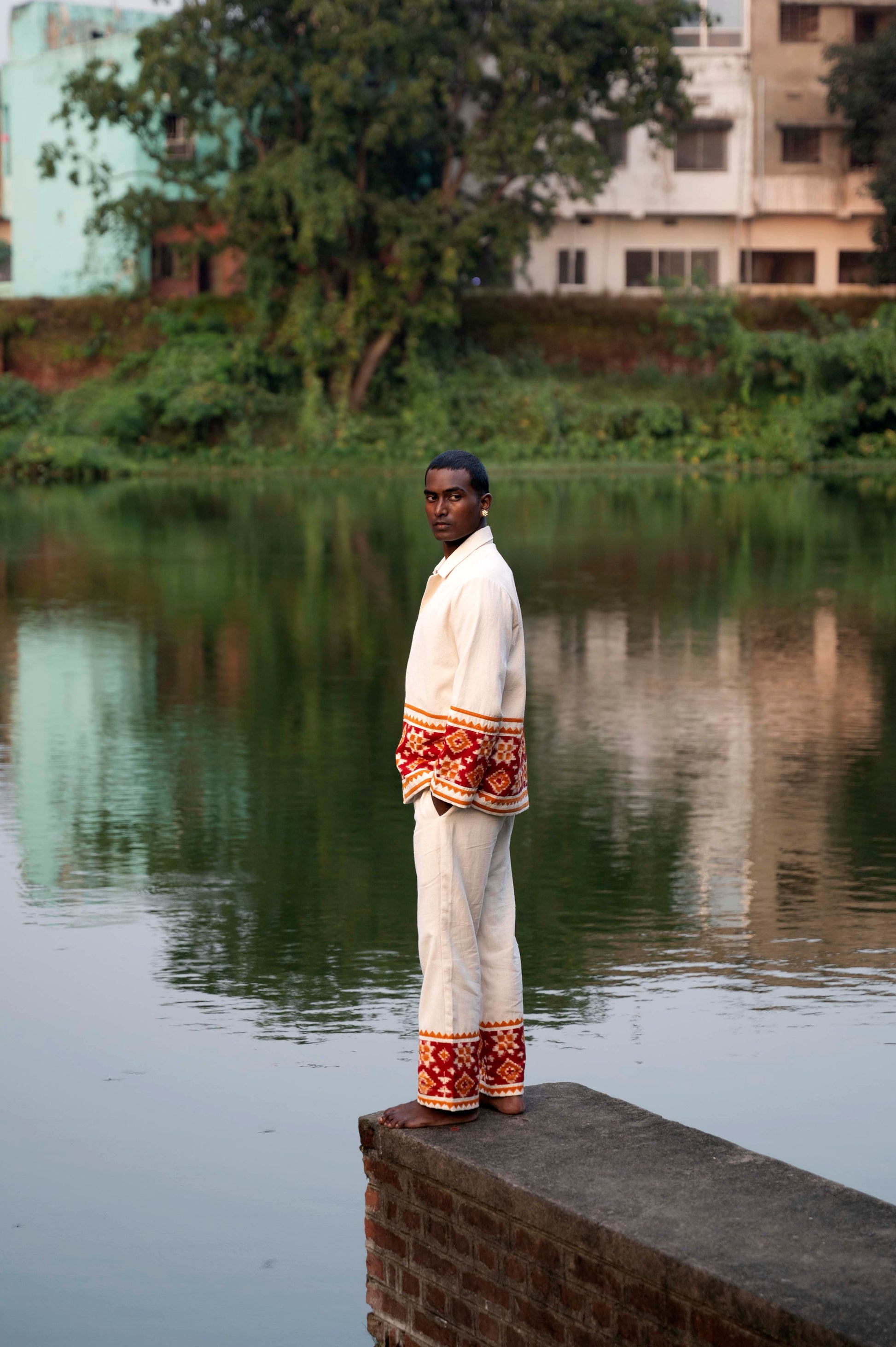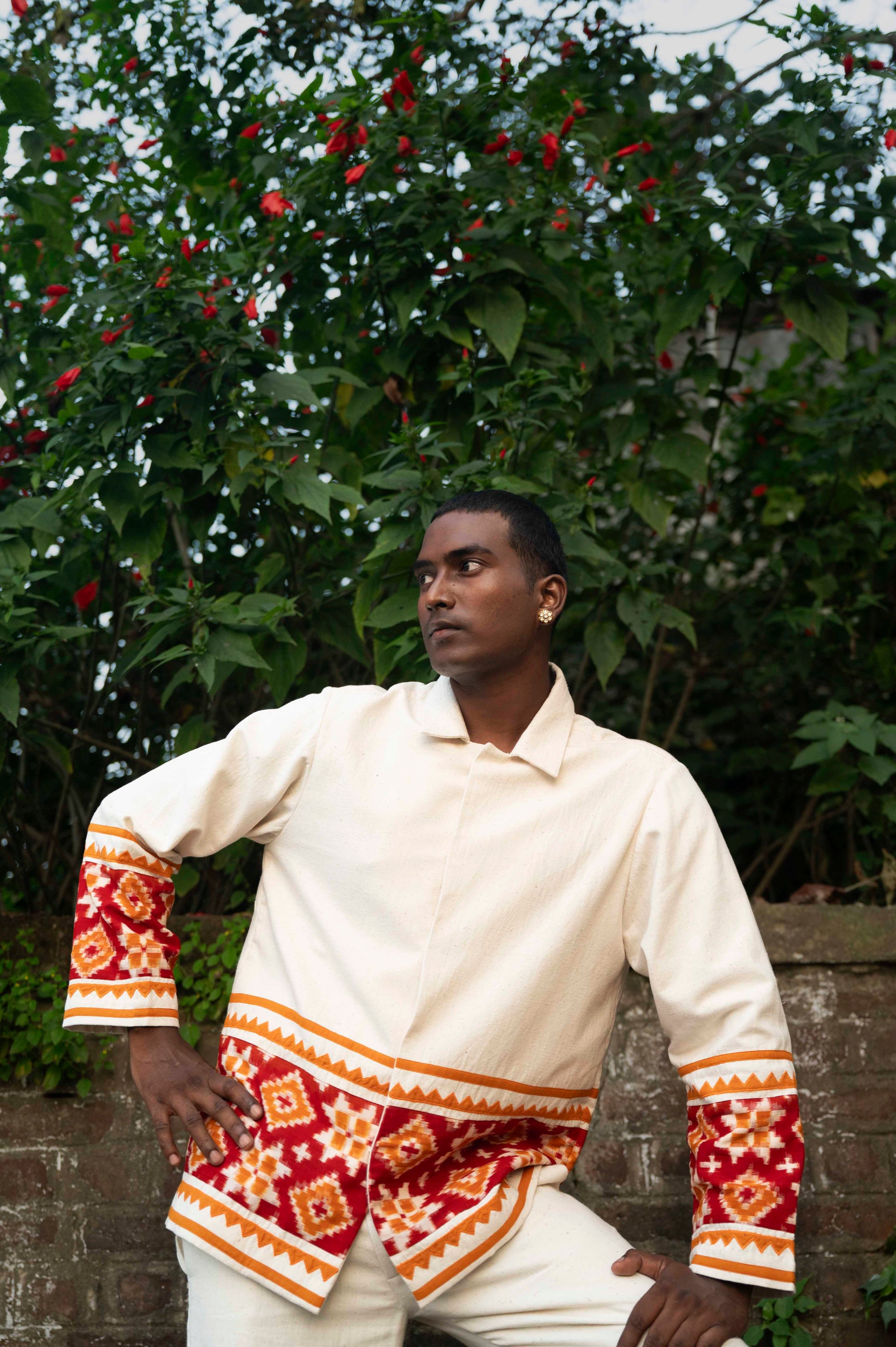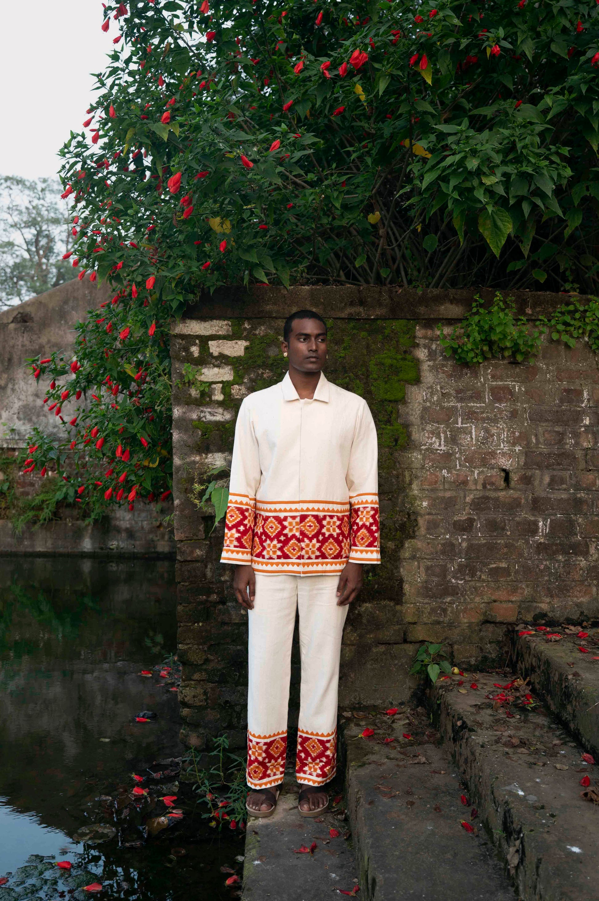 Rooted in one of the most intricate weaving traditions, double ikat and handcrafted from indigenous kala cotton, the Aravalli Overshirt is finished with delicate patch work hand-embroidery.