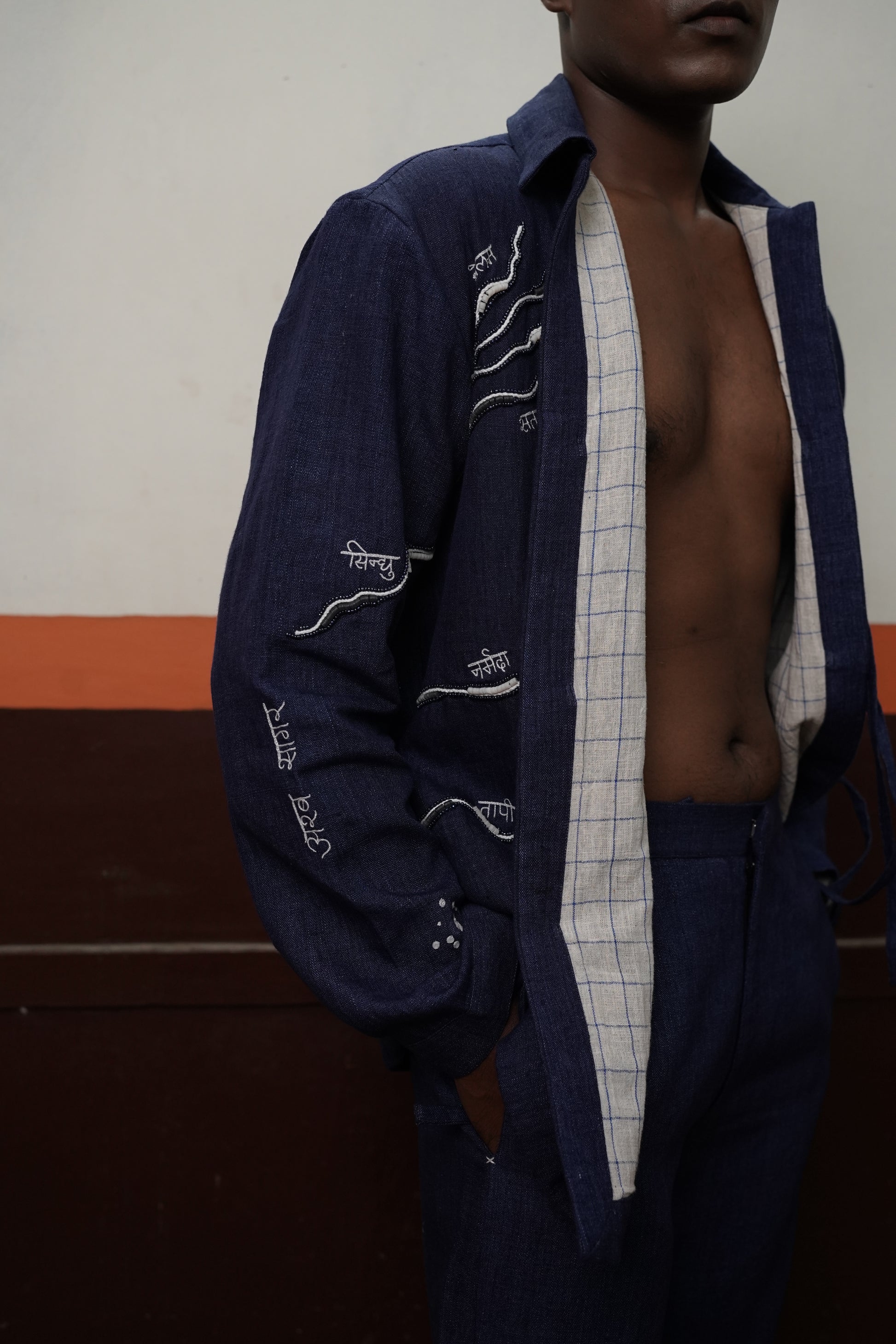 A quiet cartography rendered in thread, the Nadi Pranali Jacket traces the river map of India. Handwoven linen from Murshidabad forms the base for this jacket, embroidered entirely by hand using couching, beadwork and 3D sequin stringing. Lined with handwoven kala cotton, this thoughtfully crafted piece carries geography, memory and craft.