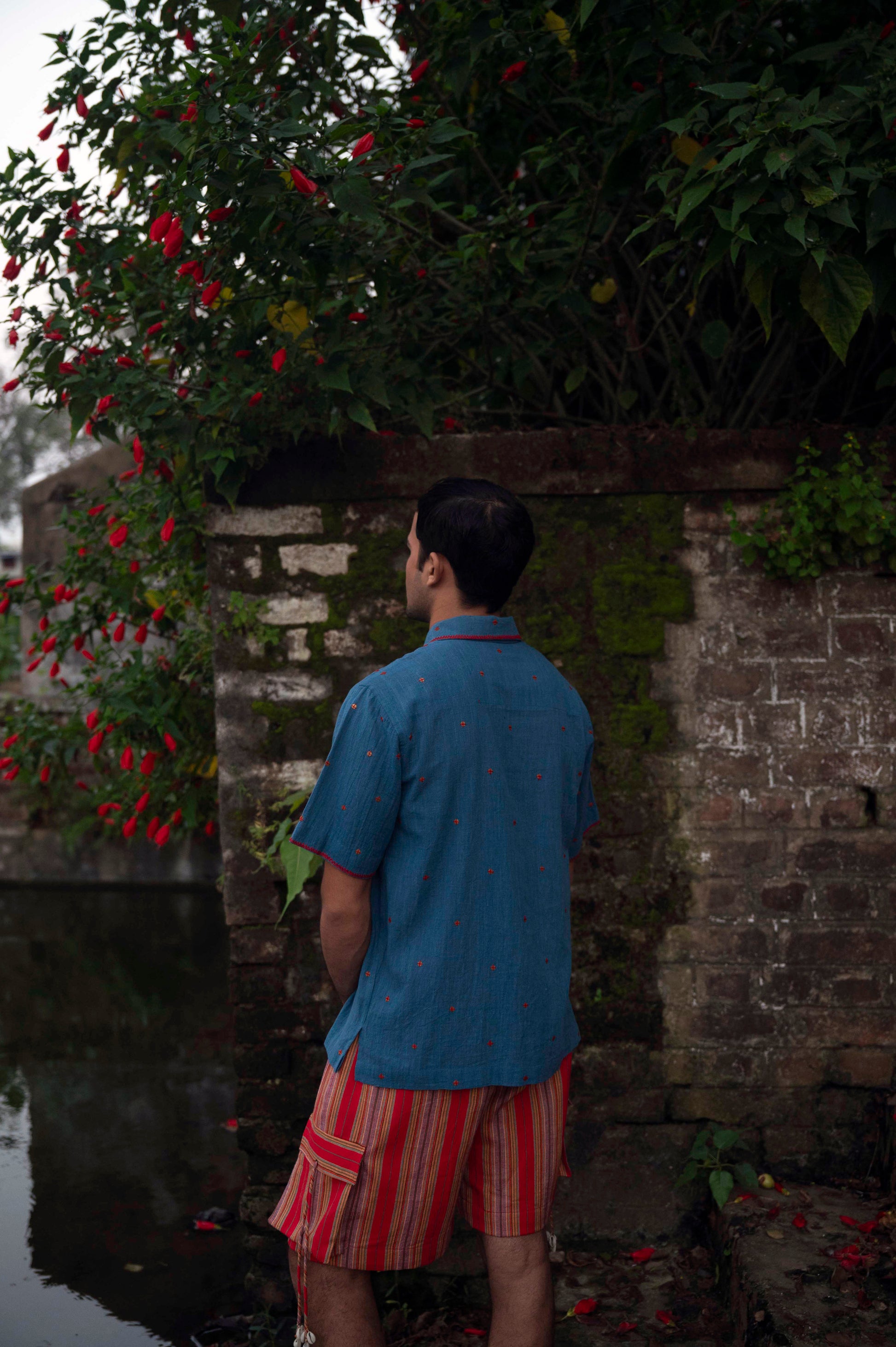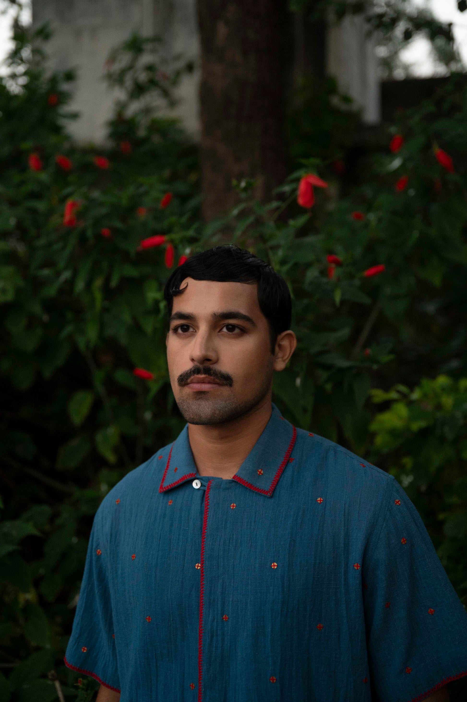 andcrafted from indigenous kala cotton, the Taramandal Shirt is embellished with pure metal sequins placed by hand and finished with delicate edge embroidery.